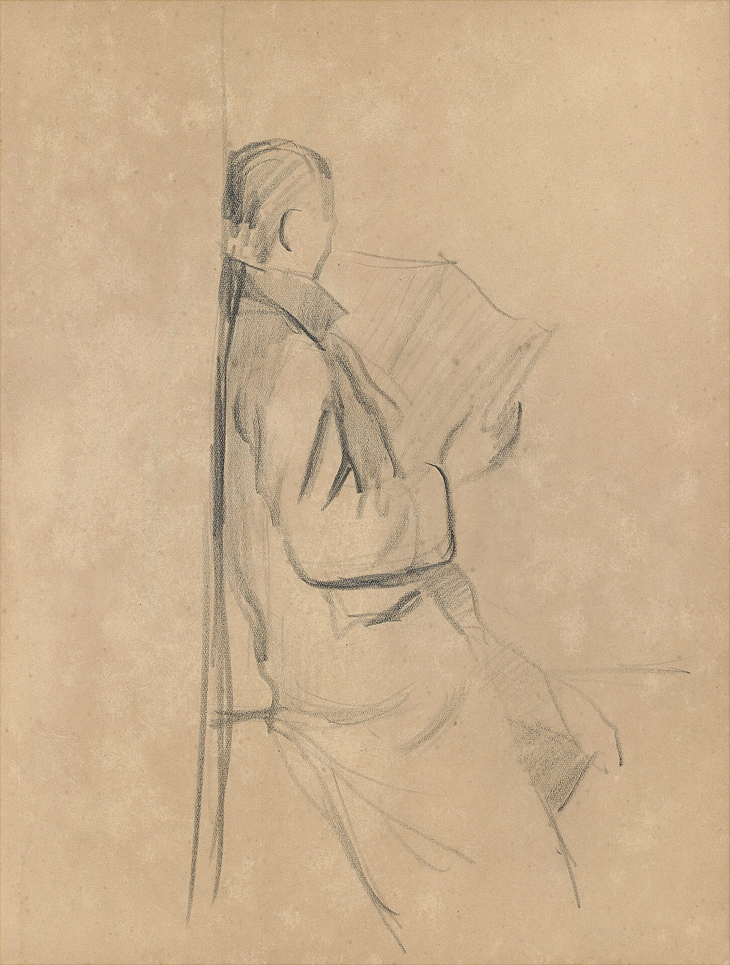 靠牆閱報的男子